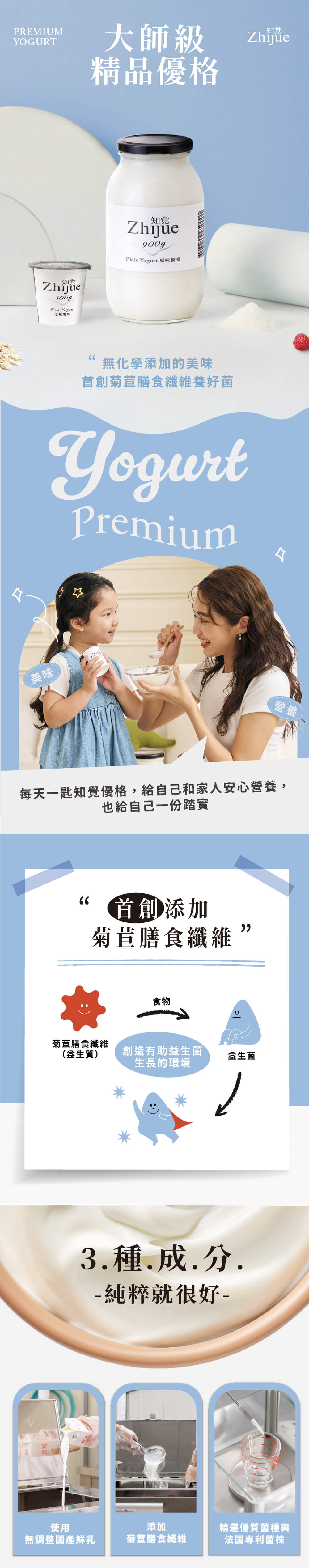 成分:無調整國產鮮乳、菊苣纖維(益生質)、保加利亞乳桿菌L. bulgaricus、嗜熱鏈球菌S. thermophilus、嗜酸乳桿菌L. acidophilus (La-14)、鼠李糖乳桿菌L. rhamnosus (Lr-32)、乾酪乳桿菌L. casei (Lc-11)、嗜酸乳桿菌NCFM L. acidophilus (NCFM)、副乾酪乳桿菌L. paracasei (Lpc-37)、羅伊氏乳桿菌L. reuteri (1E1)、長雙歧桿菌B. longum (Bl-05)